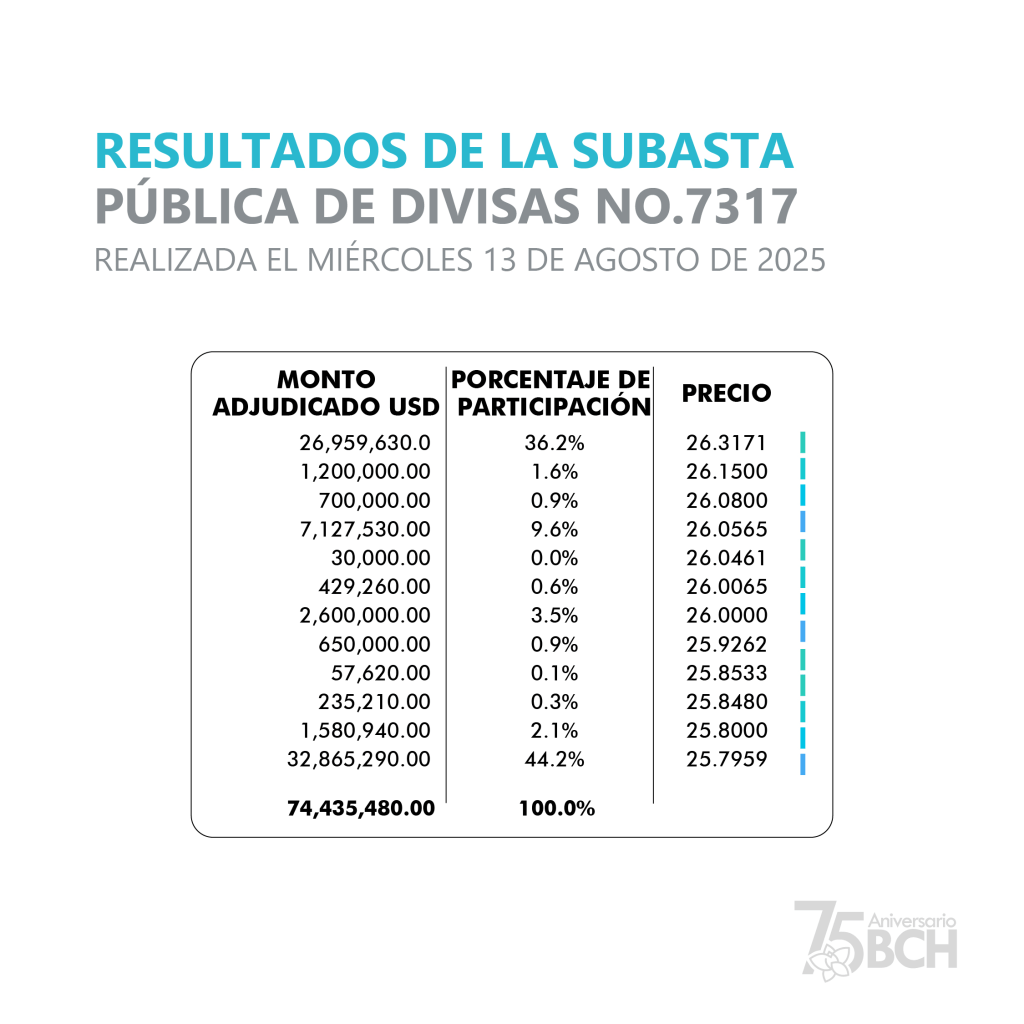 En paralelo, el Banco Central de Honduras informó que en la Subasta de Divisas del 13/08/2025 se adjudicaron US$74.4 millones, resultado de la ponderación de precios ofertados.